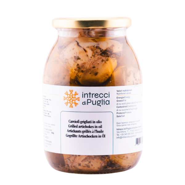 I Carciofi Grigliati in Olio di Intrecci di Puglia sono un piacere raffinato per il palato, preparati con carciofi freschi, grigliati per esaltarne il sapore unico. Conservati in una combinazione di olio di semi di girasole e olio extra vergine di oliva, sono arricchiti con aceto di vino, aglio, prezzemolo e un pizzico di peperoncino per un gusto aromatico e bilanciato. Perfetti come antipasto o contorno, aggiungono un tocco di autenticitร pugliese a ogni piatto.